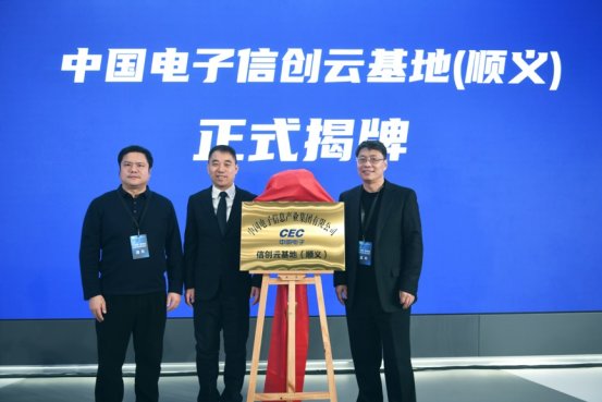 随后,中国电子运营管理部副主任唐路,中国电子规划科技部主任助理邬成利,中国系统高级副总裁兼中国电子云执行总裁马劲共同为中国电子信创云基地(顺义)揭牌。